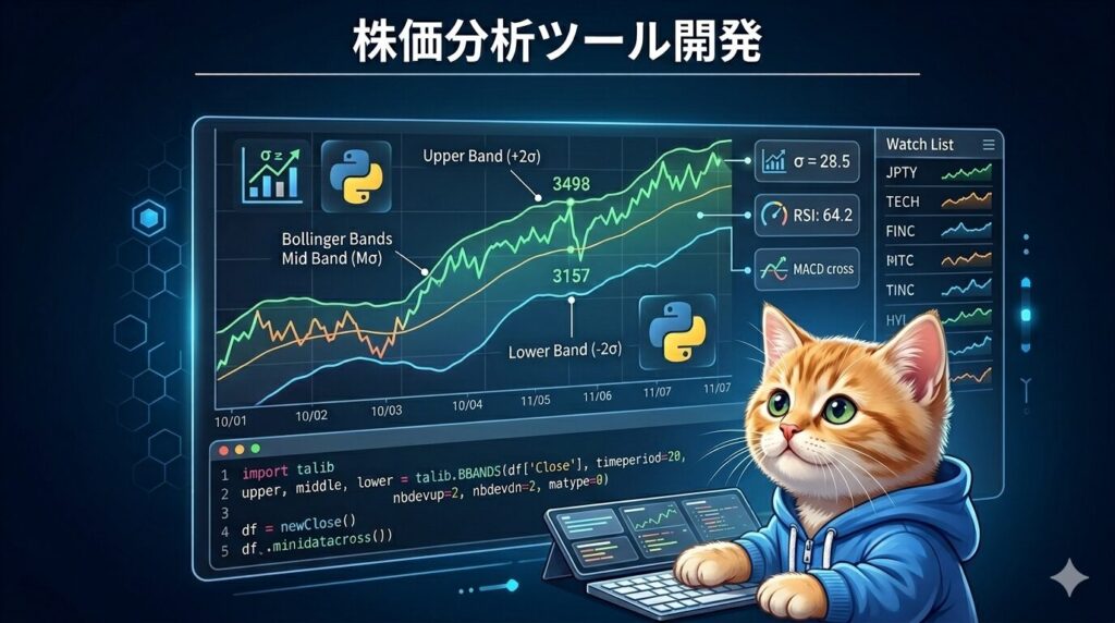 前回の記事では、yfinanceとPandasを使って株価データを取得する方法を解説しました。データが揃ったら、次はいよいよ「分析」のフェーズです。 今回は、テクニカル指標の中でも人気の高い「ボリンジャーバンド」をPythonで実装する方法を解説します。 ボ... -