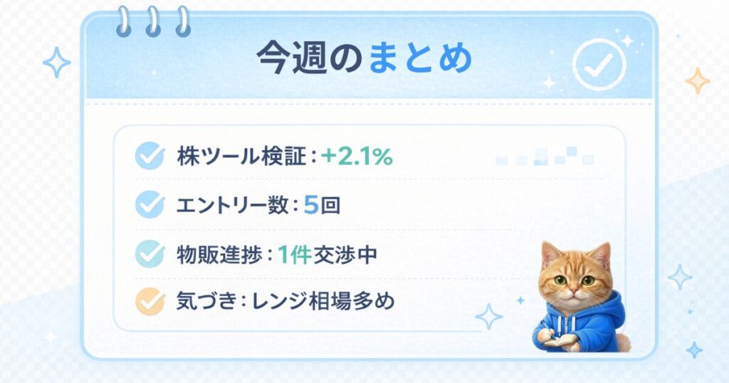 📊 今週の「三連単」サマリー 📦 物販:Amazonメーカー仕入れ必要なツールのアカウント作成等準備中。 💻 技術:Python × AI 開発今週もエラー落ちなし。10銘柄を監視安定稼働中。 📈 投資:独自スコアリングによる検証独自アルゴリズムに基づき検証実施。...
