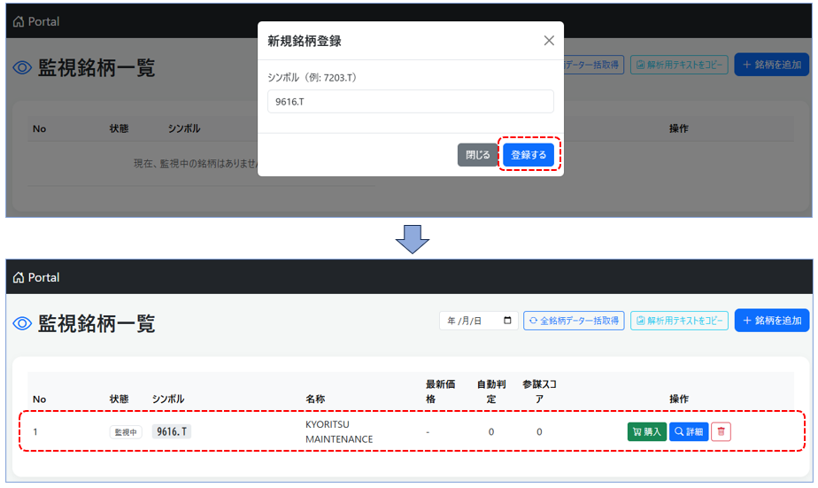 次にTradingViewのスクリーナーでヒットした銘柄のコードを自作ツールの登録画面に入力して登録します。