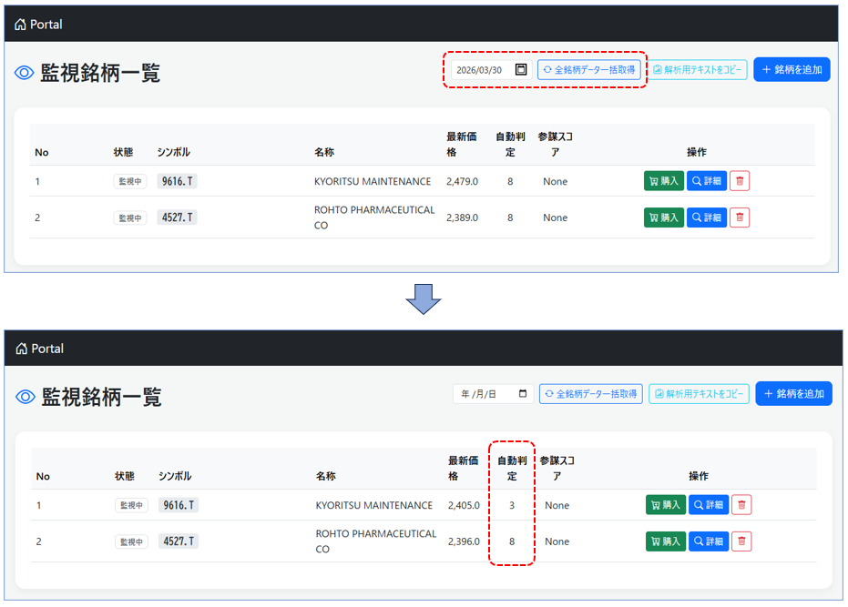 日付を指定してデータ取得のボタンを押すとPythonが裏側でyfinanceからデータを取得し、瞬時にスコアを算出します。RSIや移動平均線、出来高などを組み合わせて独自のスコアリングを行っています。