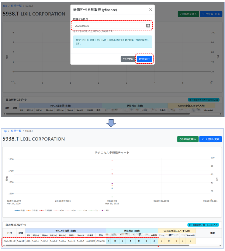 銘柄詳細画面の「データ登録・更新」画面に取得する日付を設定し「取得実行」ボタンを押下します。