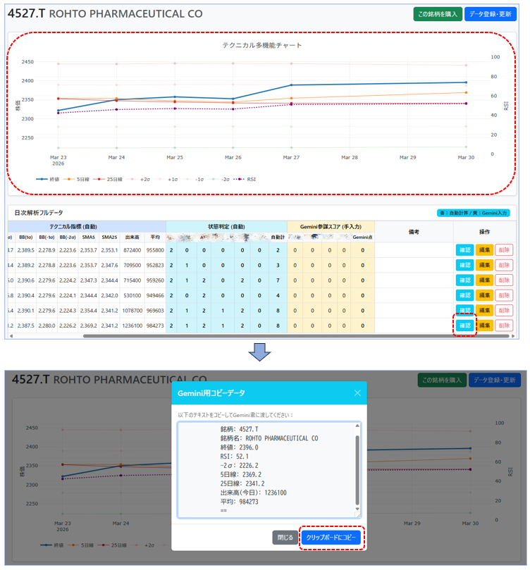 また、「確認」ボタン押下するだけでAIが解析に必要なテクニカルデータを整形してコピーできる仕組みにしました。これをAIに貼り付けるだけで、即座に客観的なAI解析が始まります。