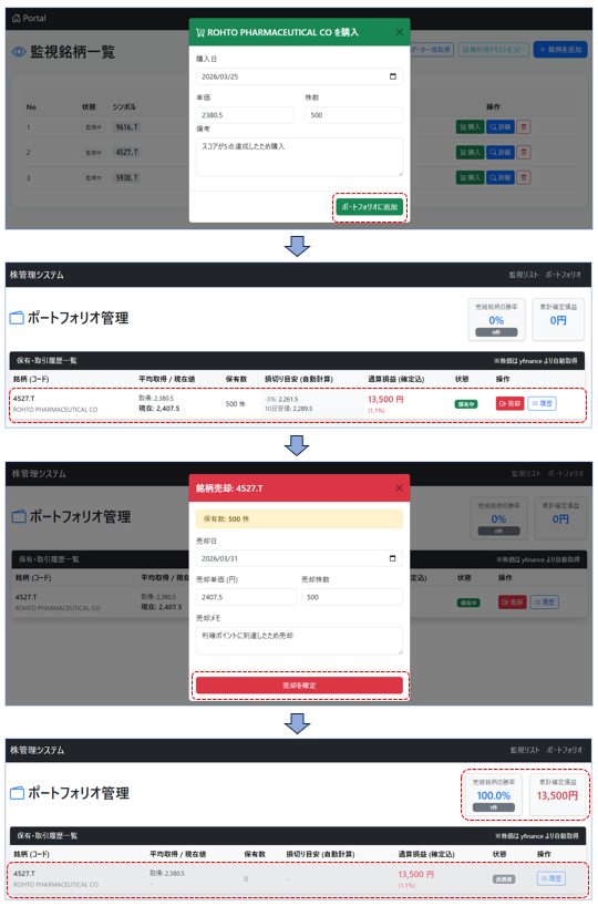 - AI: 監視銘柄のデータをAIに渡し、客観的な「買い」の判断を補強。