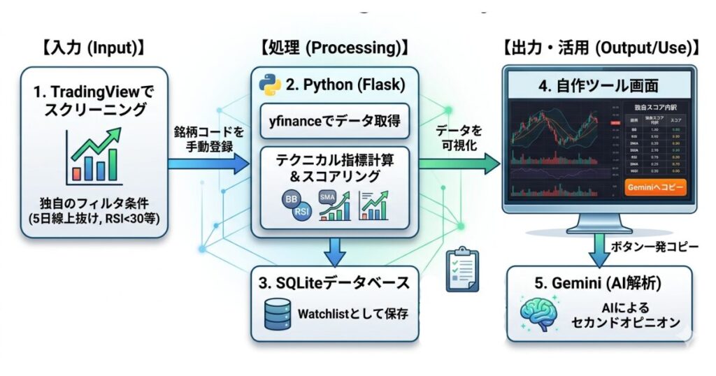 チャートツール「TradingView」でスクリーニングし、自作ツールで「詳細分析・管理」、最後に「AI」で投資判断する。これが私の構築した「エンジニア的投資フロー」です。